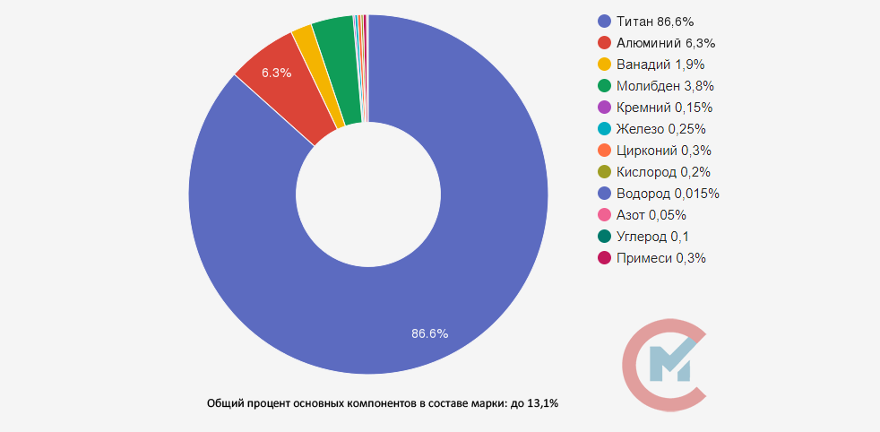 В основе сплава — титан (Ti) от 86,635% до 93,1%. По ГОСТ 19807-91 и ОСТ1 90013-81 общее количество примесей не превышает 0,3%. Массовая доля водорода до 0,015% для слитков. Массовая доля алюминия 3,5-4,5% в плоском прокате из сплава толщиной 10мм, а в остальных видах полуфабрикатов — 4,5-6,3%. Суммарная массовая доля молибдена и вольфрама не должна превышать 3,8%. Массовая доля железа (Fe) до 0,3%, углерода (C) до 0,1%, кремния (Si) до 0,15%, ванадия (V) от 0,9% до 1,9%, азота (N) до 0,05%, циркония (Zr) до 0,3% и кислорода (O) до 0,15%. Массовая доля хрома и марганца не больше 0,15%. Массовая доля меди и никеля не более 0,1%.