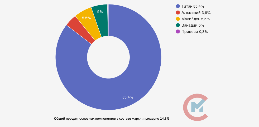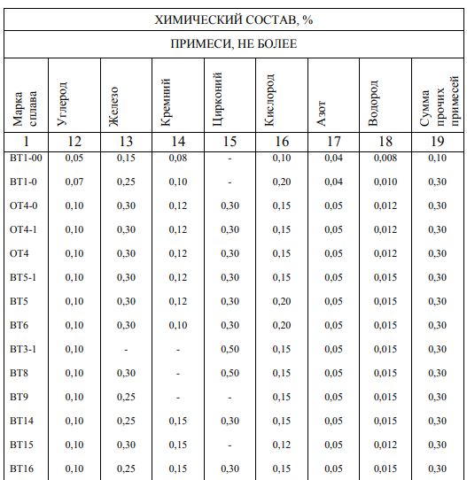 Титан марки ВТ16 — это металлический сплав, в основе которого титан (Ti), в процентном соотношении от 82,885% до 89,7%.